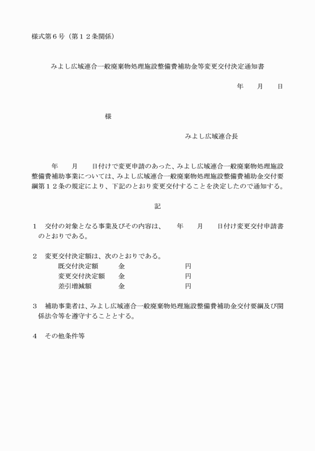 第12条 広域連合長は、補助金等の変更交付決定をしたときは、速やかにその決定の内容及びこれに付した条件を、補助金等変更交付決定通知書(様式第6号)により当該申請者に通知する。